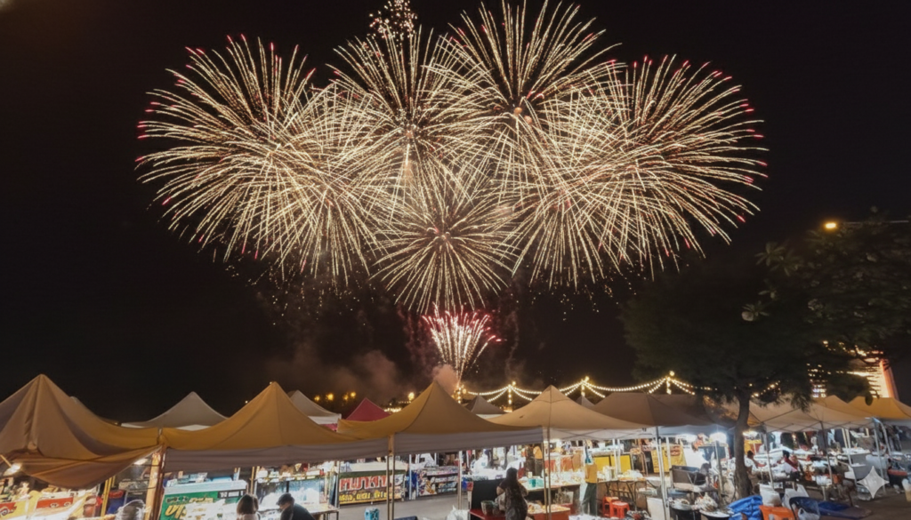 - Reflection: หากในภาพมีแหล่งน้ำ ลองสั่งให้ AI เพิ่มเงาสะท้อนของพลุในน้ำ “Add subtle, realistic fireworks reflections on the water surface.” จะช่วยให้ภาพดูอลังการขึ้นมากครับ